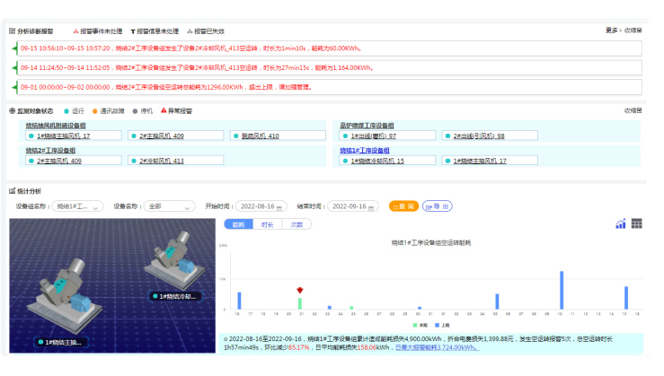 包含現場能效走勢、能耗指標看板、節能分析結論及報警懸浮窗口等功能模塊,通過上述模塊,用戶可快速掌握現場監測范圍內歷史及實時用能概況。