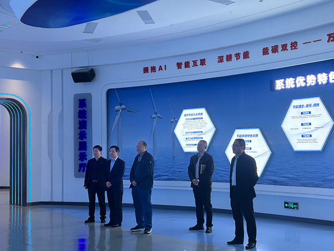 張處長一行先后參觀了公司一樓文化展示廳與節能展廳,詳細了解萬洲電氣發展歷程、科技創新成果、節能系統核心優勢及能碳管理平臺應用情況,對公司在系統節能領域的深耕積淀與創新突破給予高度評價。