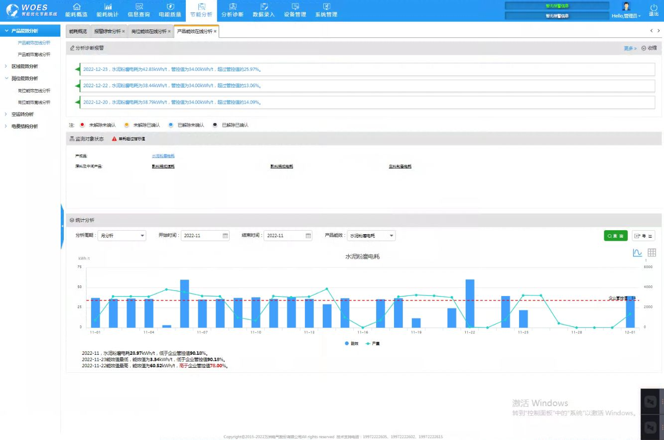 5、單耗、產量關聯分析節能。通過產品能效分析發現生料工區單耗存在異常情況;將能耗異常告知用戶后,并指導用戶通過系統發現份生料磨主電機、循環風機電機運行負荷均高于額定負荷的80%,且單耗均處于16.60-18.9kwh/t之間,合理調整生料磨主電機、循環風機負荷比例,保證負荷率處于75%~80%之間,生料工區單耗控制在了16.50kwh/t以內,平均每天減少電量7500-8000kwh,按全年生產100天計算,每年可約電費45萬元。