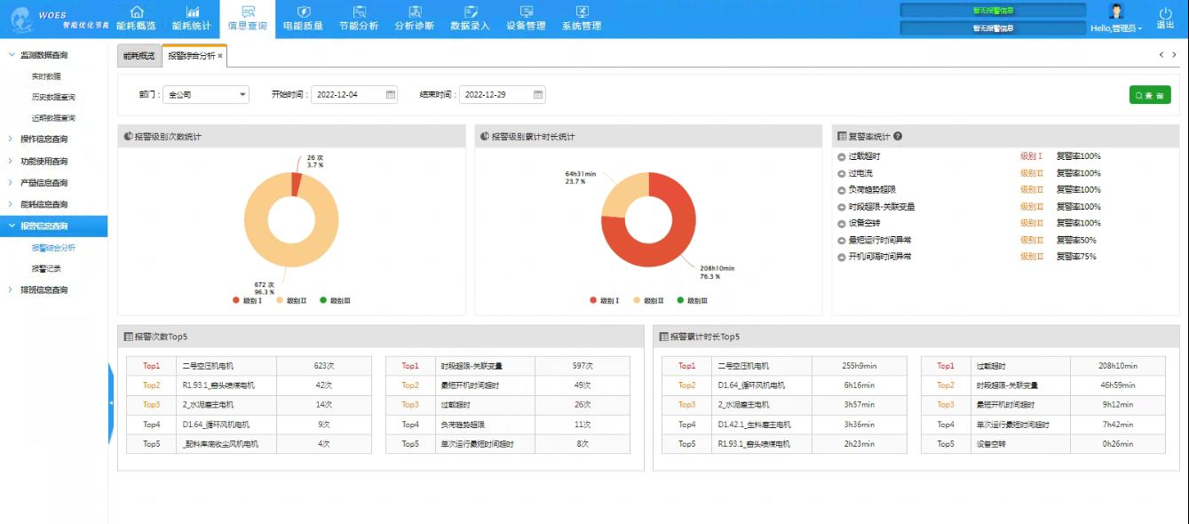 5、對水泥廠的各工段的主機設備和輔助設備之間設置關聯關系及空轉判別條件,對主機設備關停,而輔助設備沒有關停的情況進行及時報警,并計算因此導致的能源浪費量,幫助企業管理者詳細了解設備關聯運行情況,將異常定位到具備班組,解決以前有制度但執行不到位情況,通過報警功能提醒操作人員及時操作,減少能源浪費。