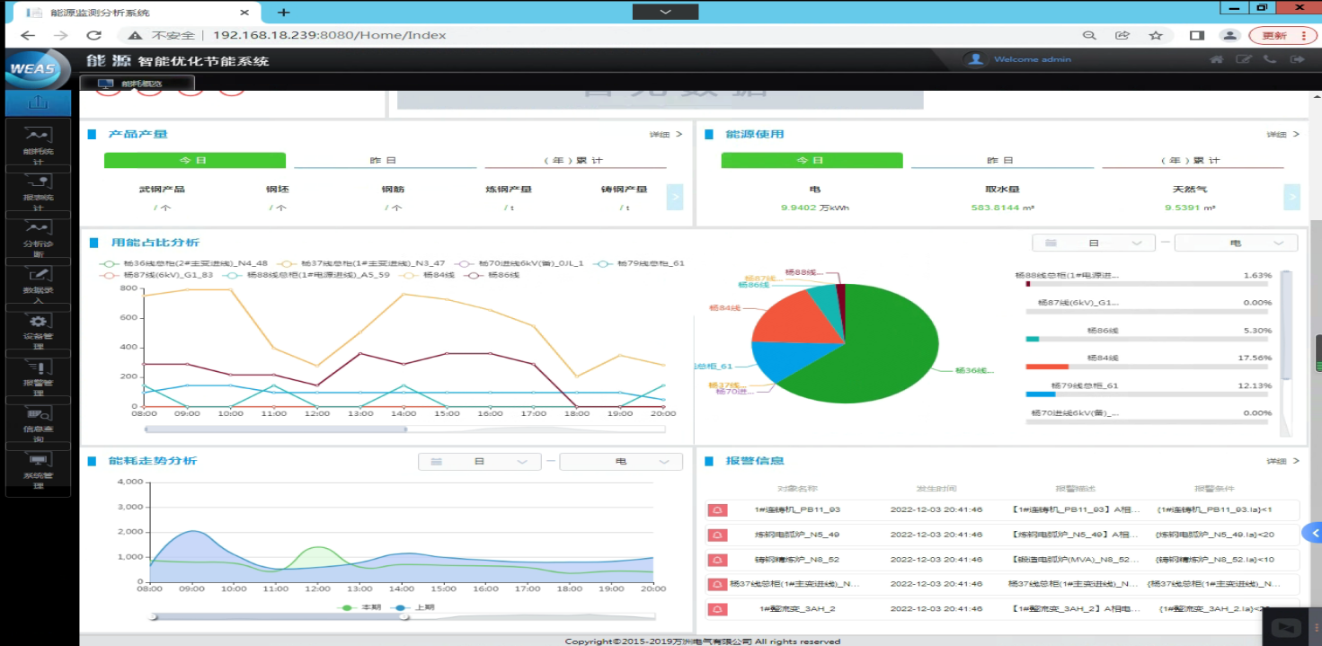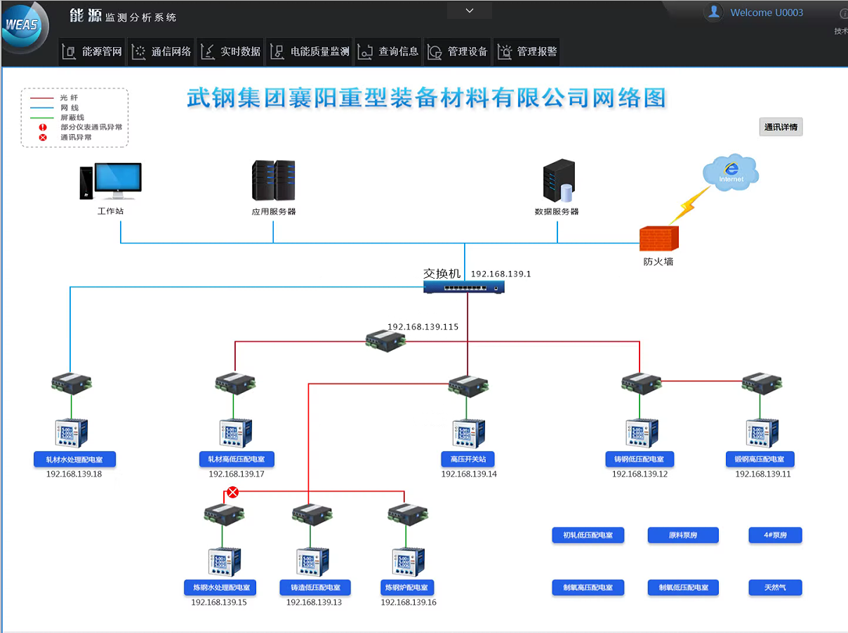 湖北某重型裝備材料有限公司W(wǎng)EAS能源監(jiān)測(cè)分析系統(tǒng)監(jiān)測(cè)能源種類(lèi)為電力、水和天然氣,監(jiān)測(cè)點(diǎn)共計(jì)102個(gè),其中電力監(jiān)測(cè)點(diǎn)86個(gè)、水系統(tǒng)監(jiān)測(cè)點(diǎn)7個(gè)、天然氣監(jiān)測(cè)點(diǎn)9個(gè)。涵蓋涵蓋煉鋼、鑄鋼、鍛鋼、軋材、制氧等區(qū)域。項(xiàng)目主要建設(shè)內(nèi)容如下: